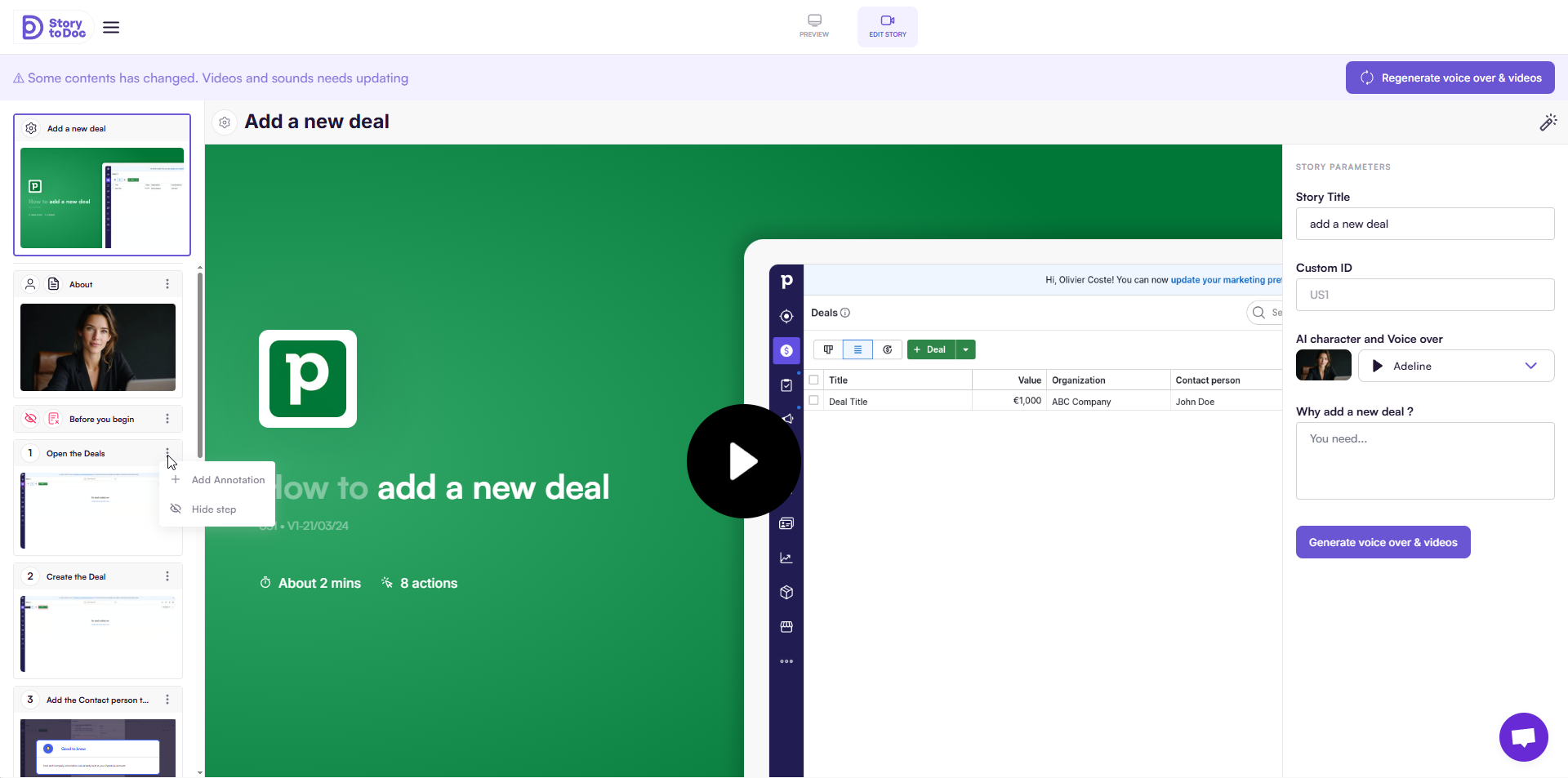 Each item now has its own little action menu. Hidden steps appear smaller, and you can change visibility with a simple click on the eye icon.